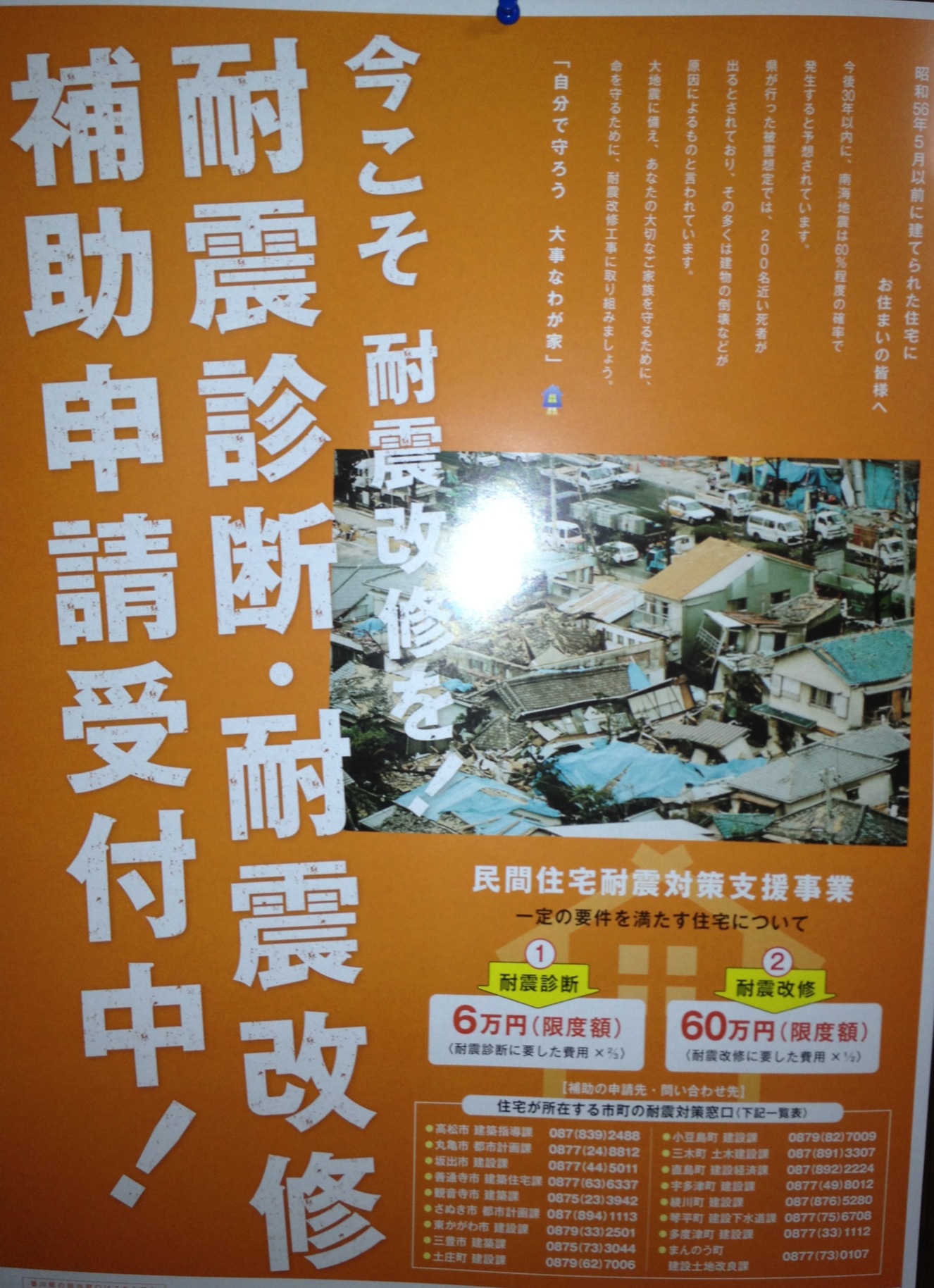 昭和56年5月以前に建てられた住宅にお住まいの皆様へ。 今後30年以内に南海地震は60%程度の確率で発生すると予想されています。 大地震に備え、あなたの大切なご家族の命を守るために、補助金を活用して今すぐ耐震診断や耐震改修工事に取り組みましょう。 この他、耐震改修工事を行った場合は、税の優遇措置もあります。 当社では、香川県木造住宅耐震対策講習会受講の1級建築士が耐震診断をおこないます。